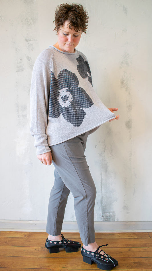 Intarsia Knit Flower Pullover in Light Grey