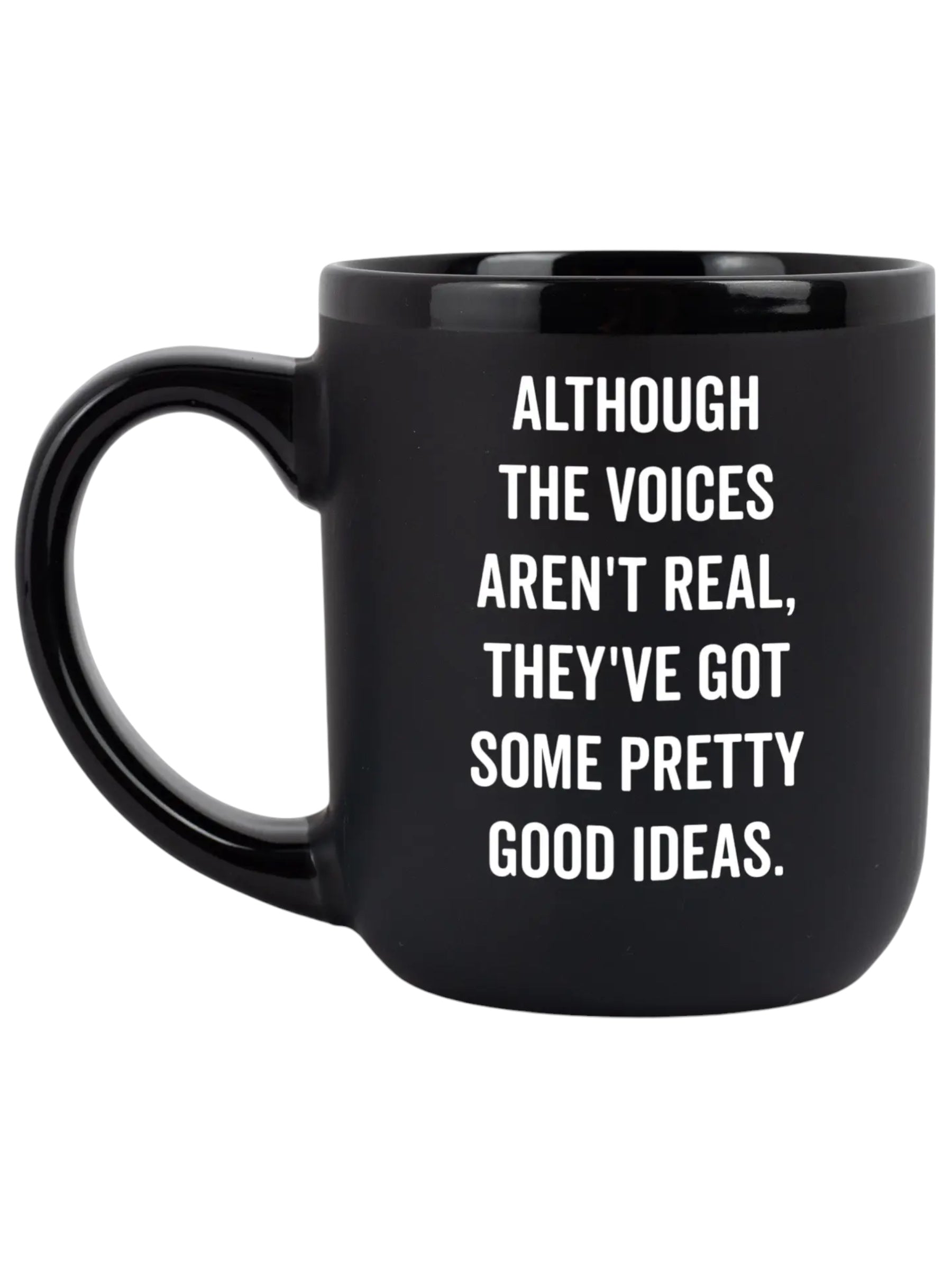 Elevate your coffee game with our "Although the Voices Aren't Real" mug. Made of ceramic, this 16 oz mug features a glossy inside, handle, and rim, and a matte finish on the outside. Its funny and snarky quote is on both sides, perfect for starting your day with a laugh. Comes in a white gift box. Hand wash for best results.