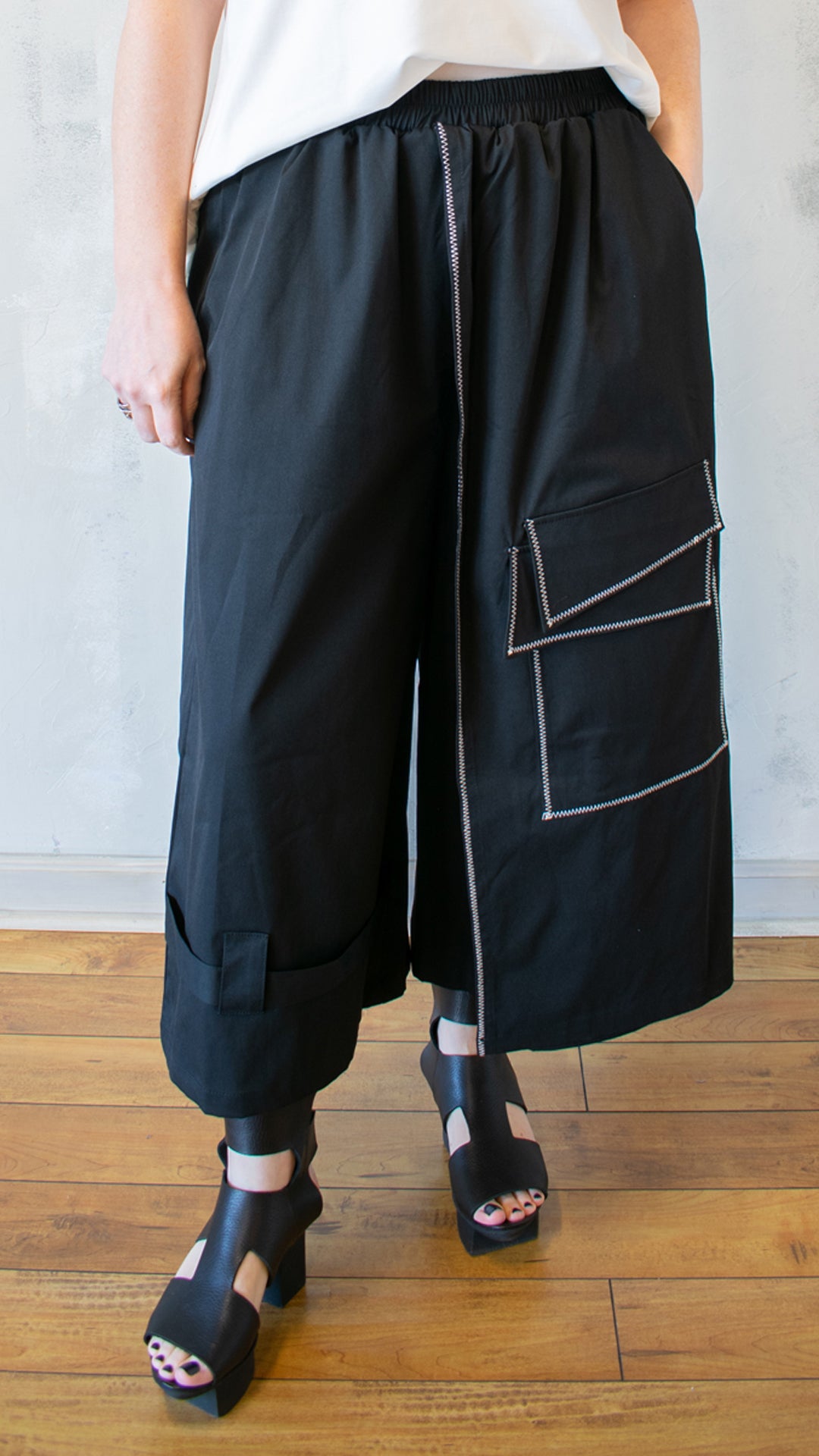 The full elastic waistband allows for ease and flexibility, while the slightly cropped length keeps the look modern and intentional. Thoughtful details and clean lines make this a versatile pant with subtle edge.