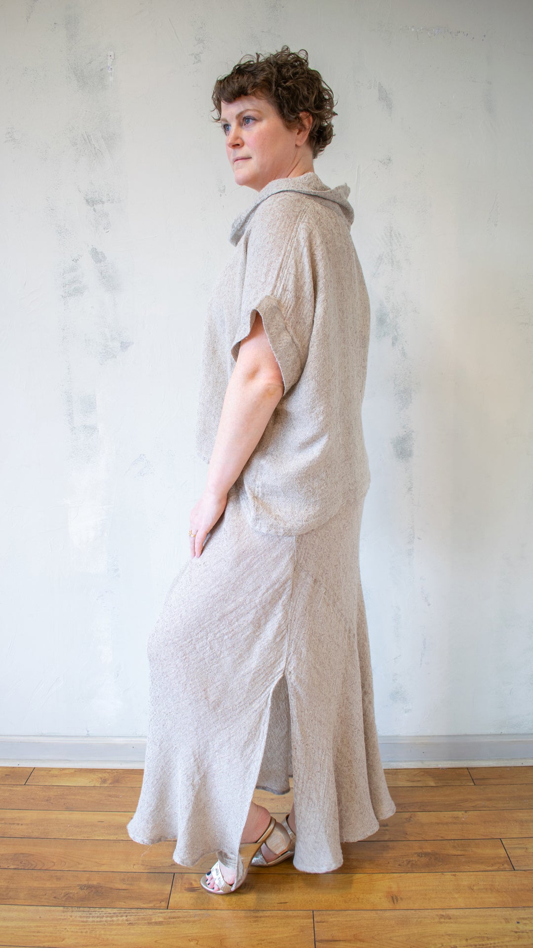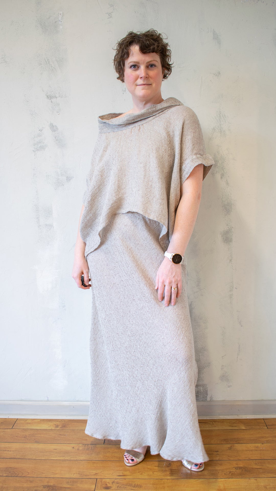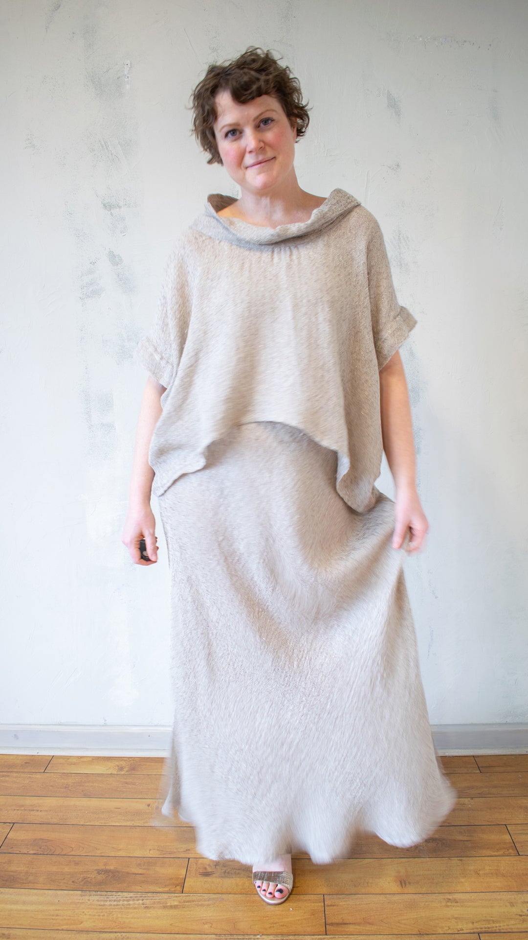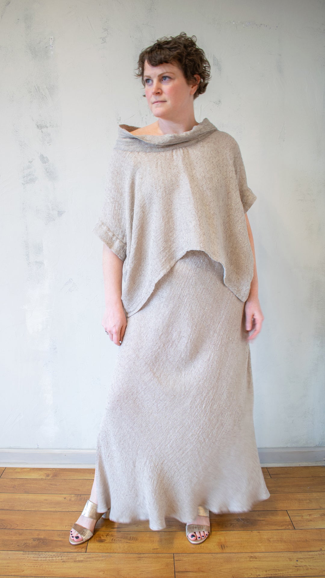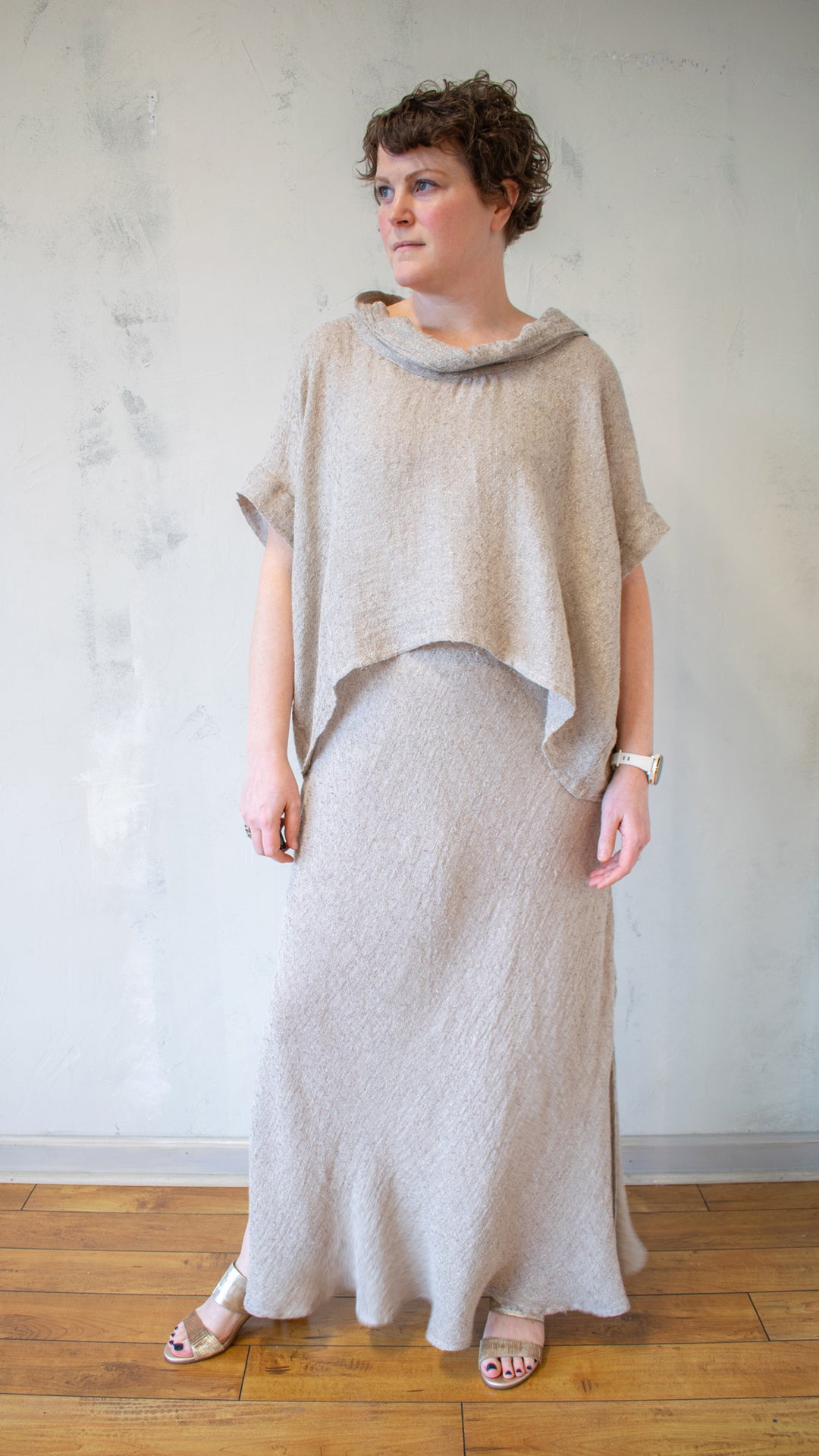 - Soft cowl neckline