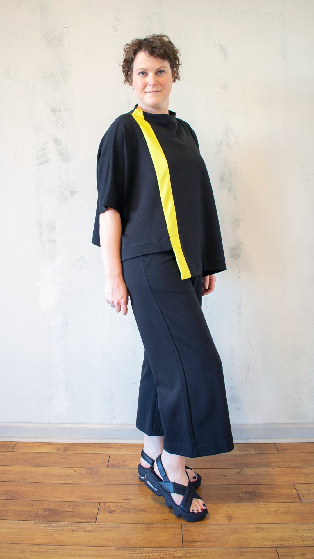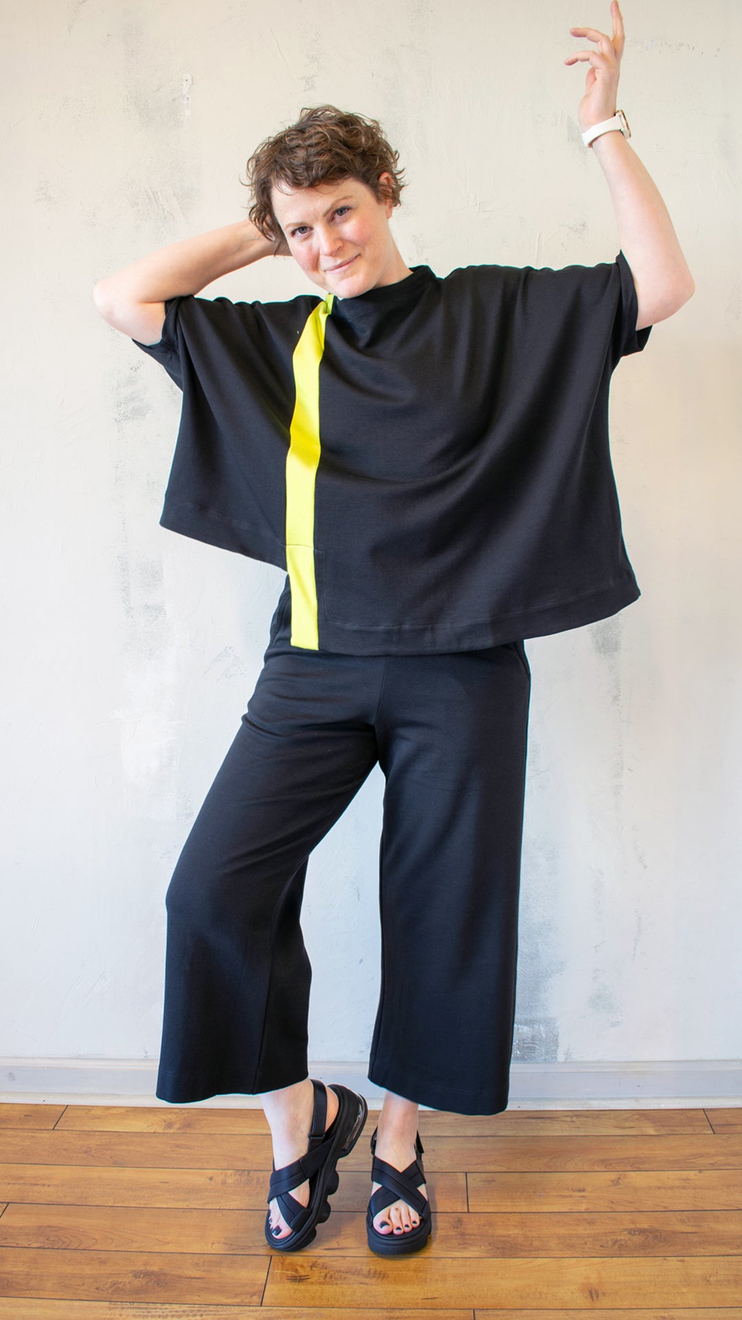 Bold yet refined, the Electric Top in Black brings Alembika’s signature graphic edge to an easy cotton knit pullover. A striking neon yellow stripe energizes the silhouette, while the hem cutout detail adds subtle architectural interest. Comfortable, expressive, and unmistakably modern.