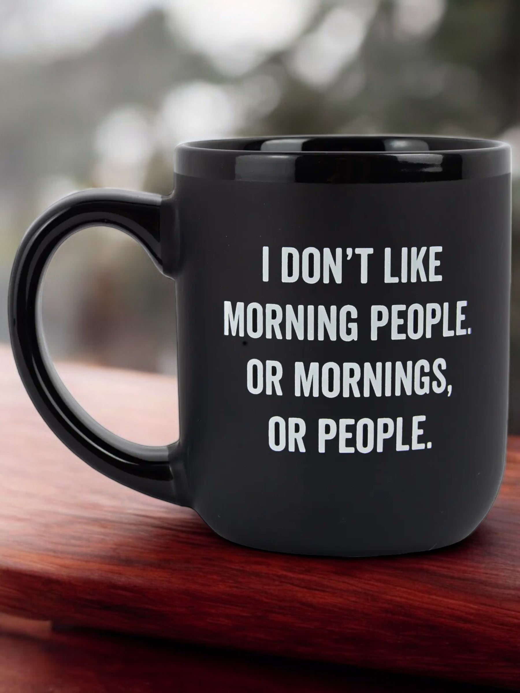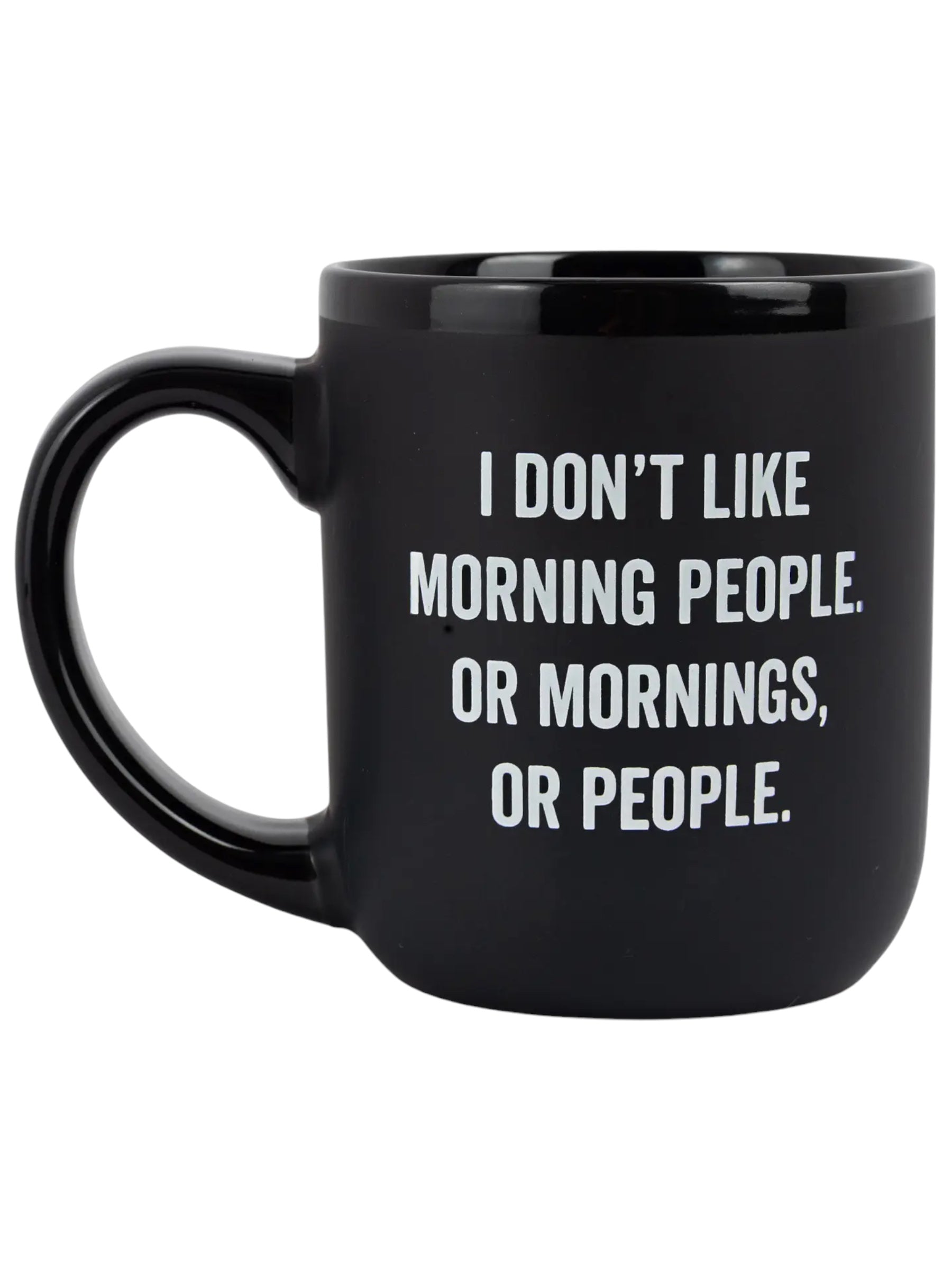Elevate your mornings with this witty "I Don't Like Morning People" coffee mug. Its black ceramic finish and glossy interior will bring a touch of humor and style to your daily routine. Hand wash for best results. Holds 16 ounces and comes in a white gift box. Double-sided quote for maximum snarkiness.