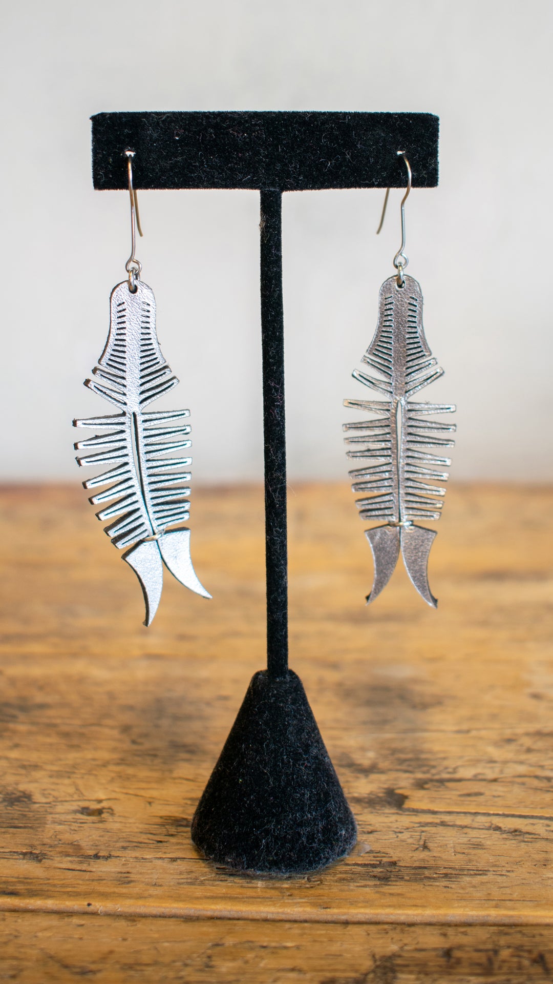 3/4” wide and 2 1/4” long, cut leather, stainless steel earwire and components