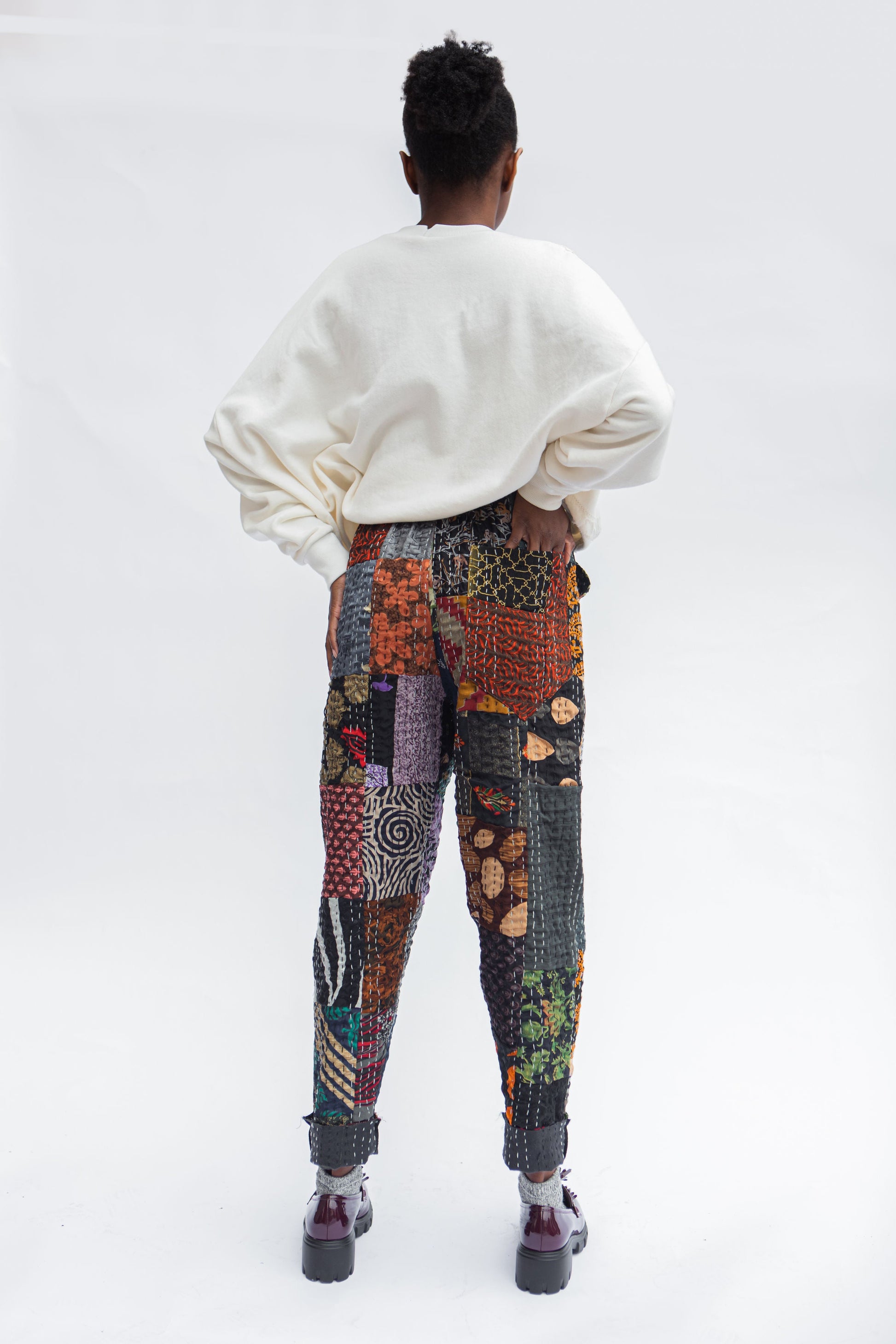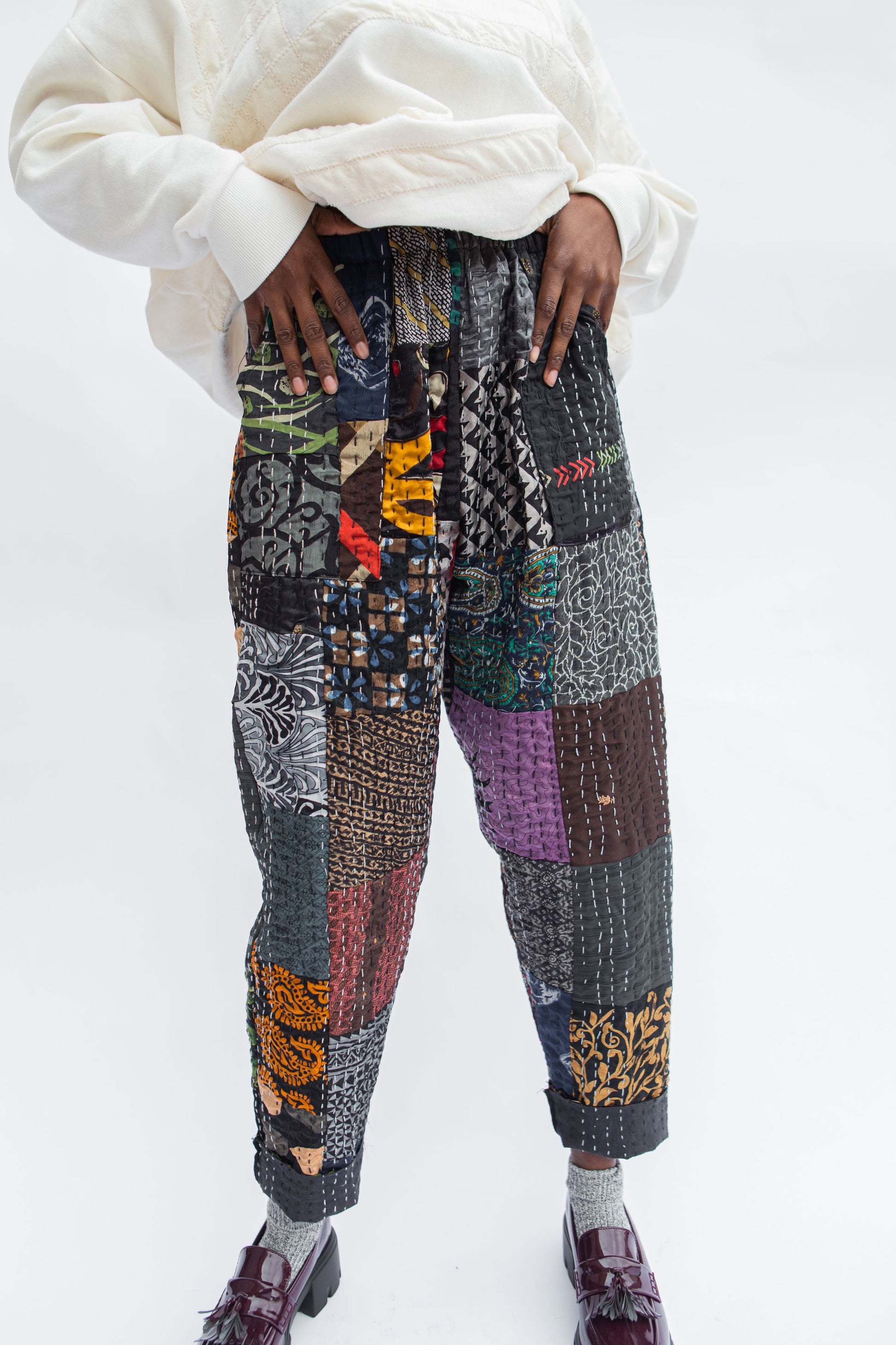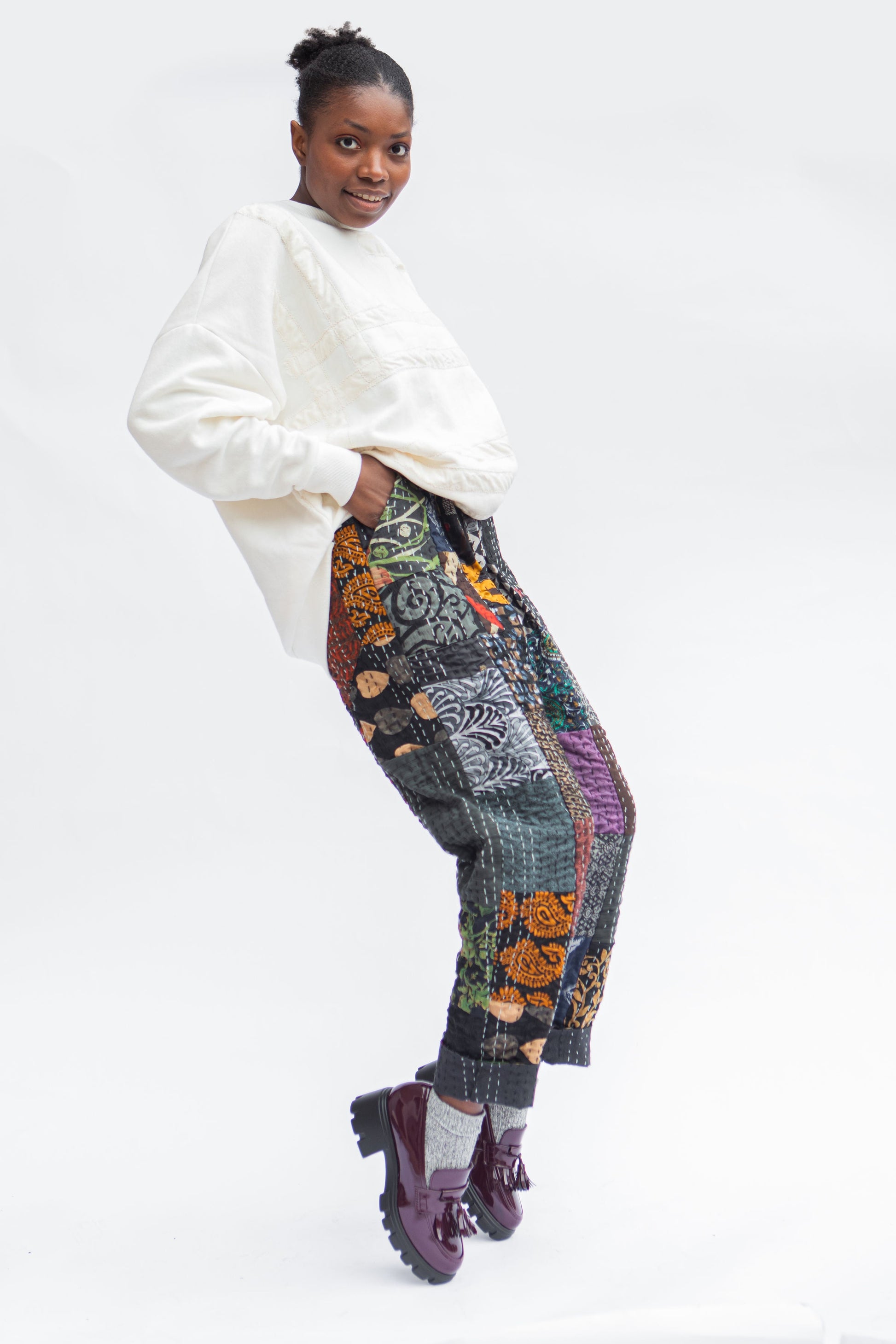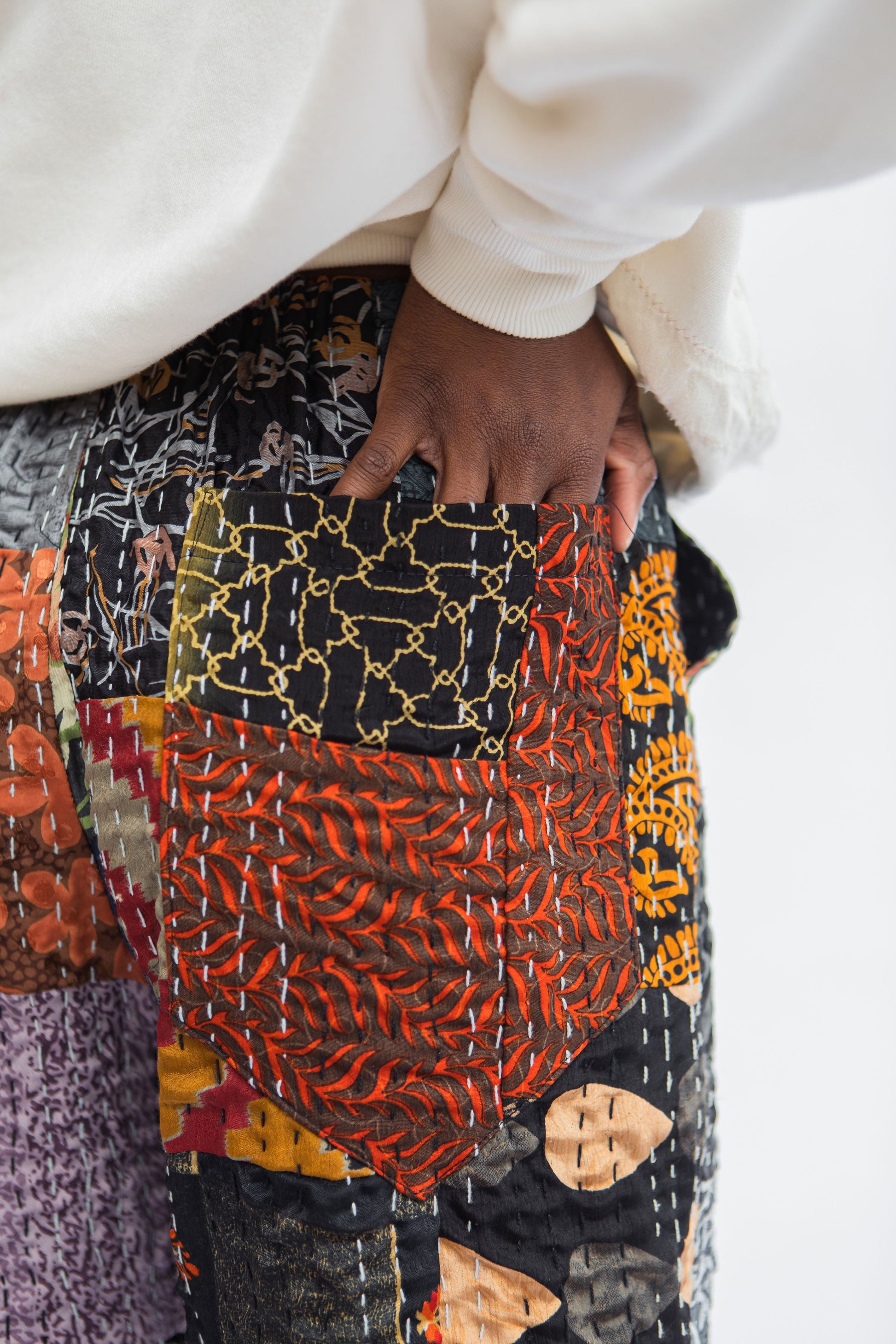 The Pocket Pant in stitched Kantha offers an inclusive fit with a relaxed silhouette and elasticized waist for optimal comfort. Crafted from silk and cotton sari scraps, hand-stitched and quilted to create a plush feel while still being stylish. Like most of Megan's pieces, these feel like comfortable lounge pants but look slick and stylish!