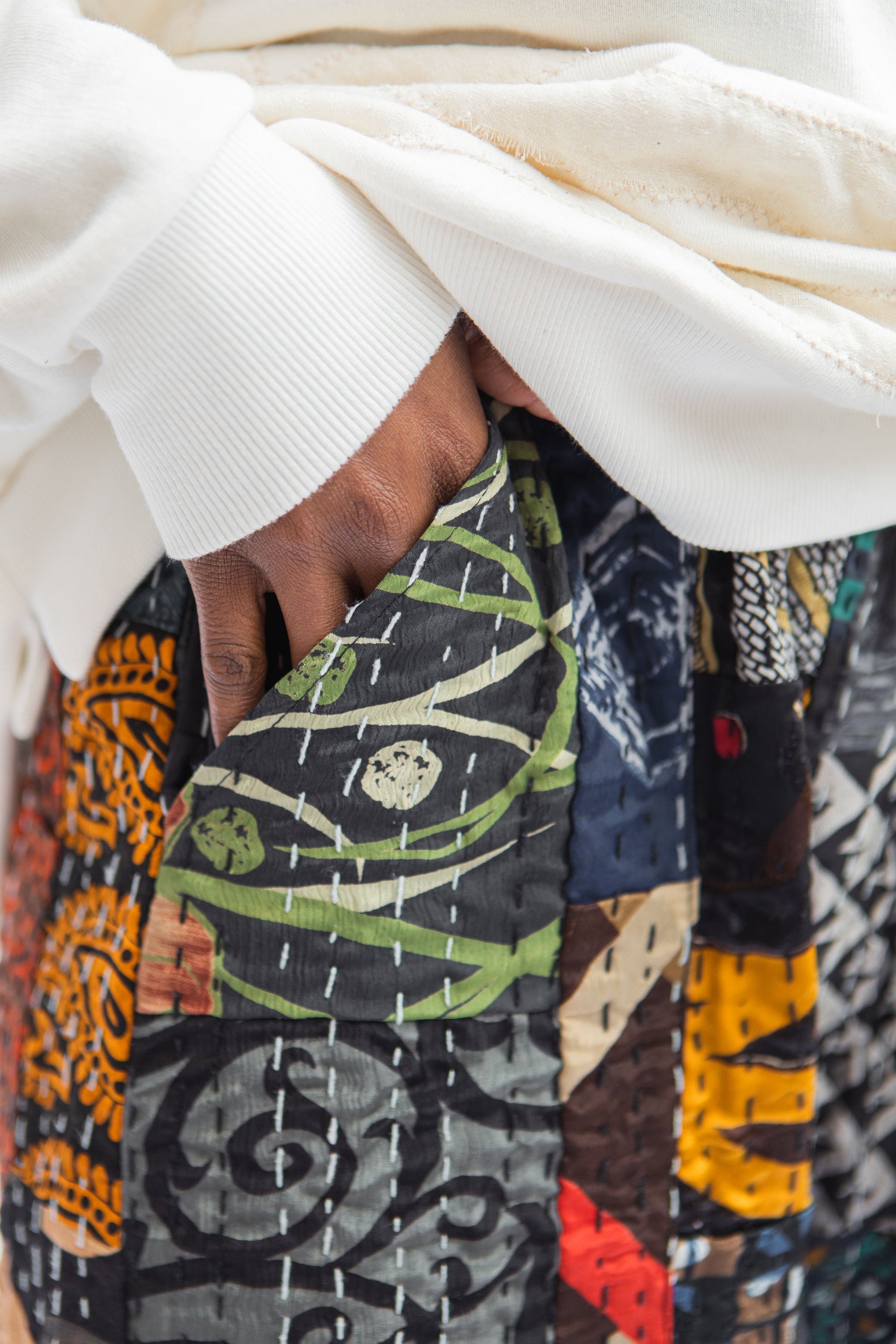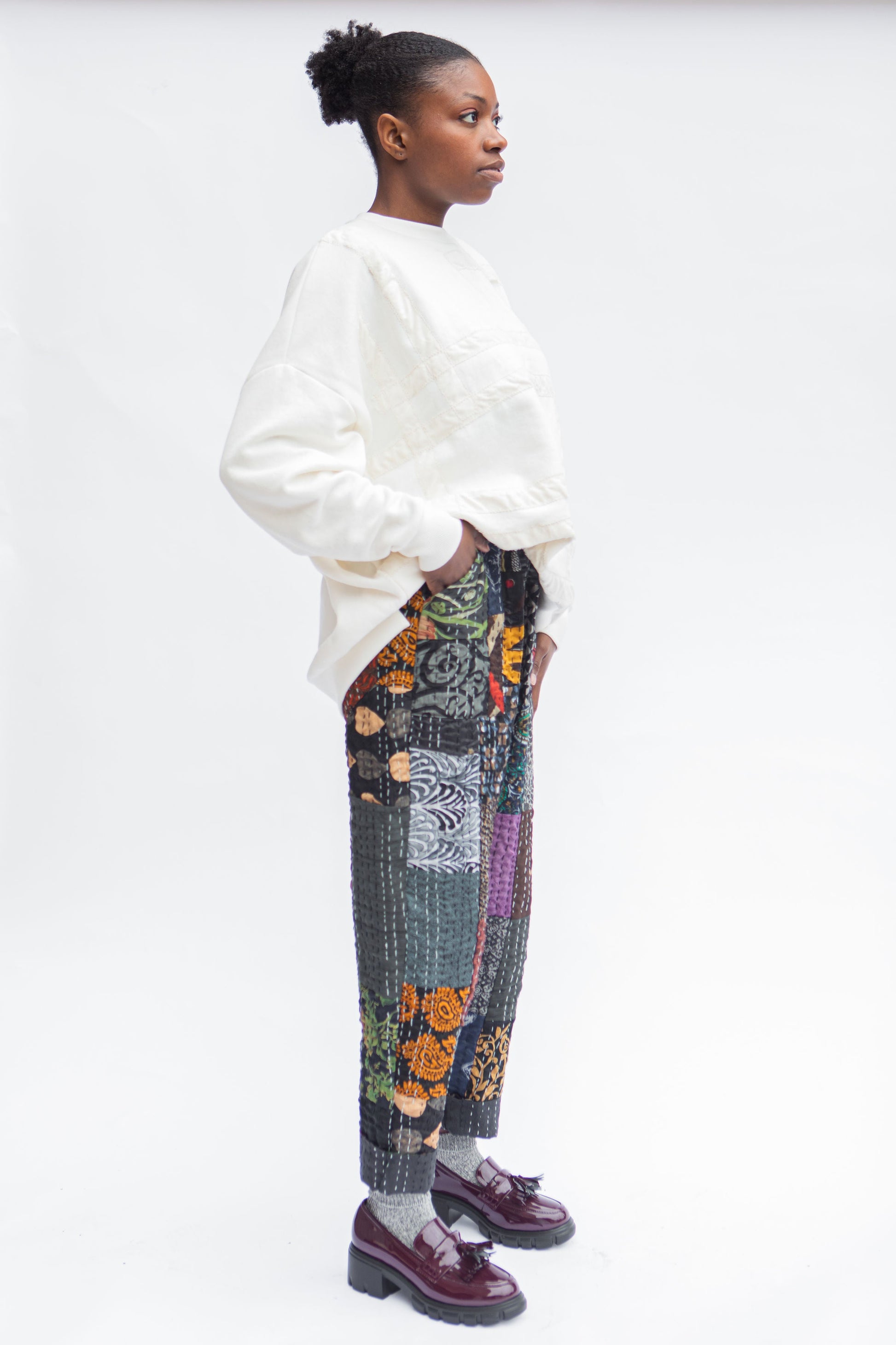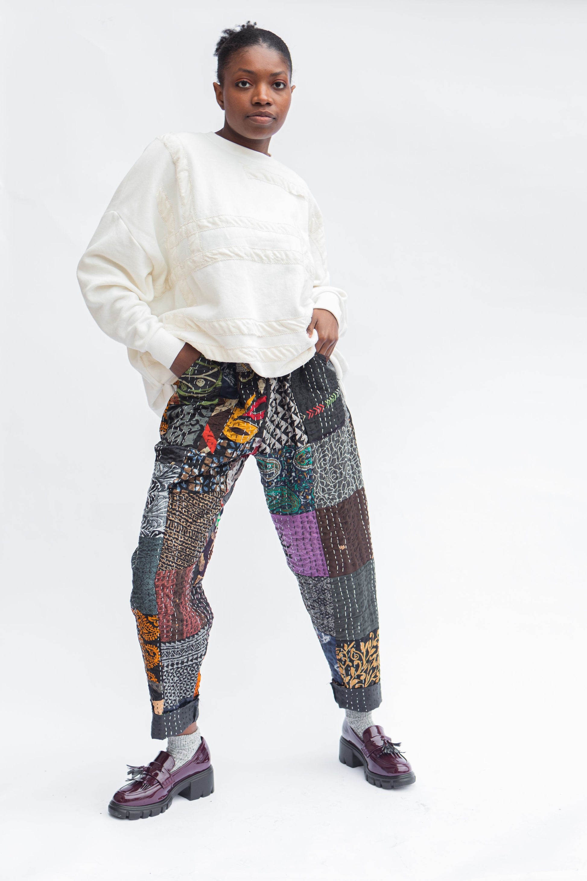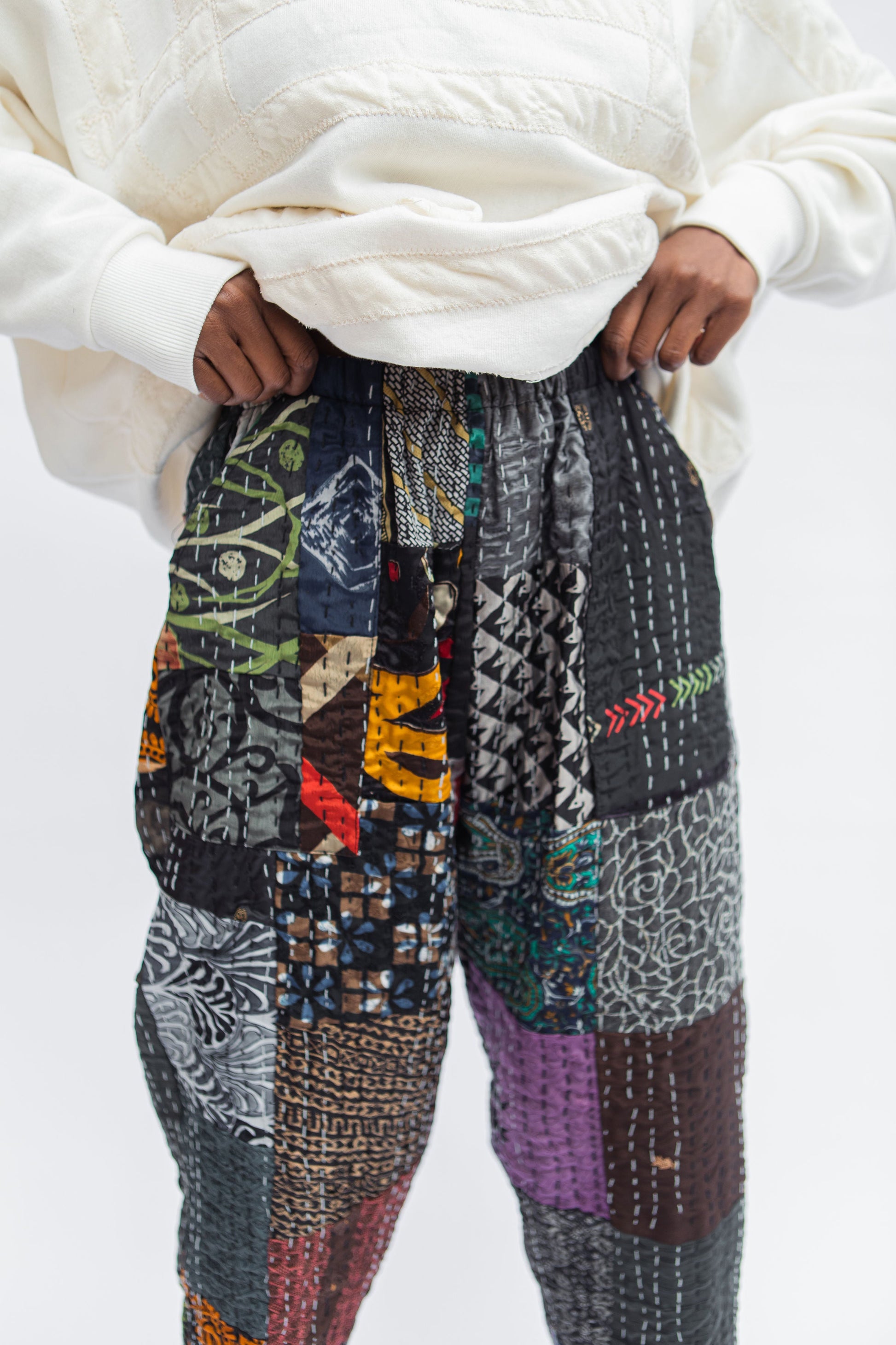 The Pocket Pant in stitched Kantha offers an inclusive fit with a relaxed silhouette and elasticized waist for optimal comfort. Crafted from silk and cotton sari scraps, hand-stitched and quilted to create a plush feel while still being stylish. Like most of Megan's pieces, these feel like comfortable lounge pants but look slick and stylish!