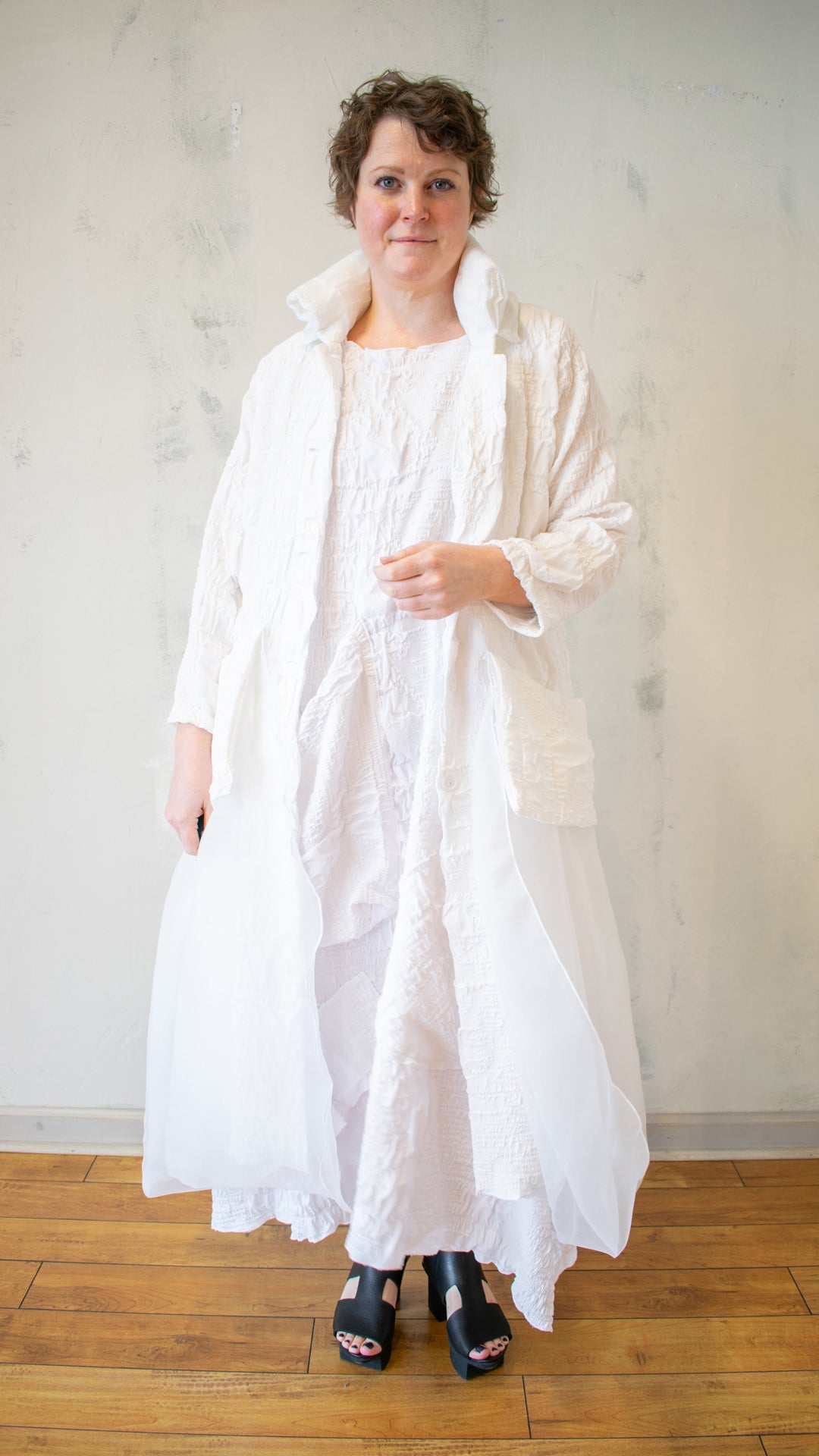 A three-button front closure keeps the silhouette clean and understated, while airy tulle accents along the hem introduce movement and a quiet sense of romance. This is a piece designed for layering—elegant, expressive, and effortlessly wearable.
