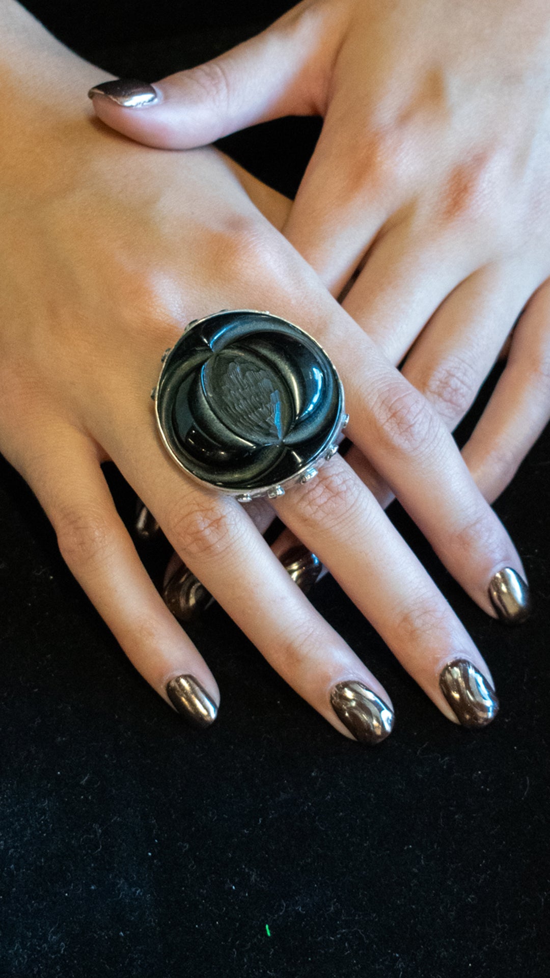 R18- Vintage black original carving Bakelite in sterling silver setting