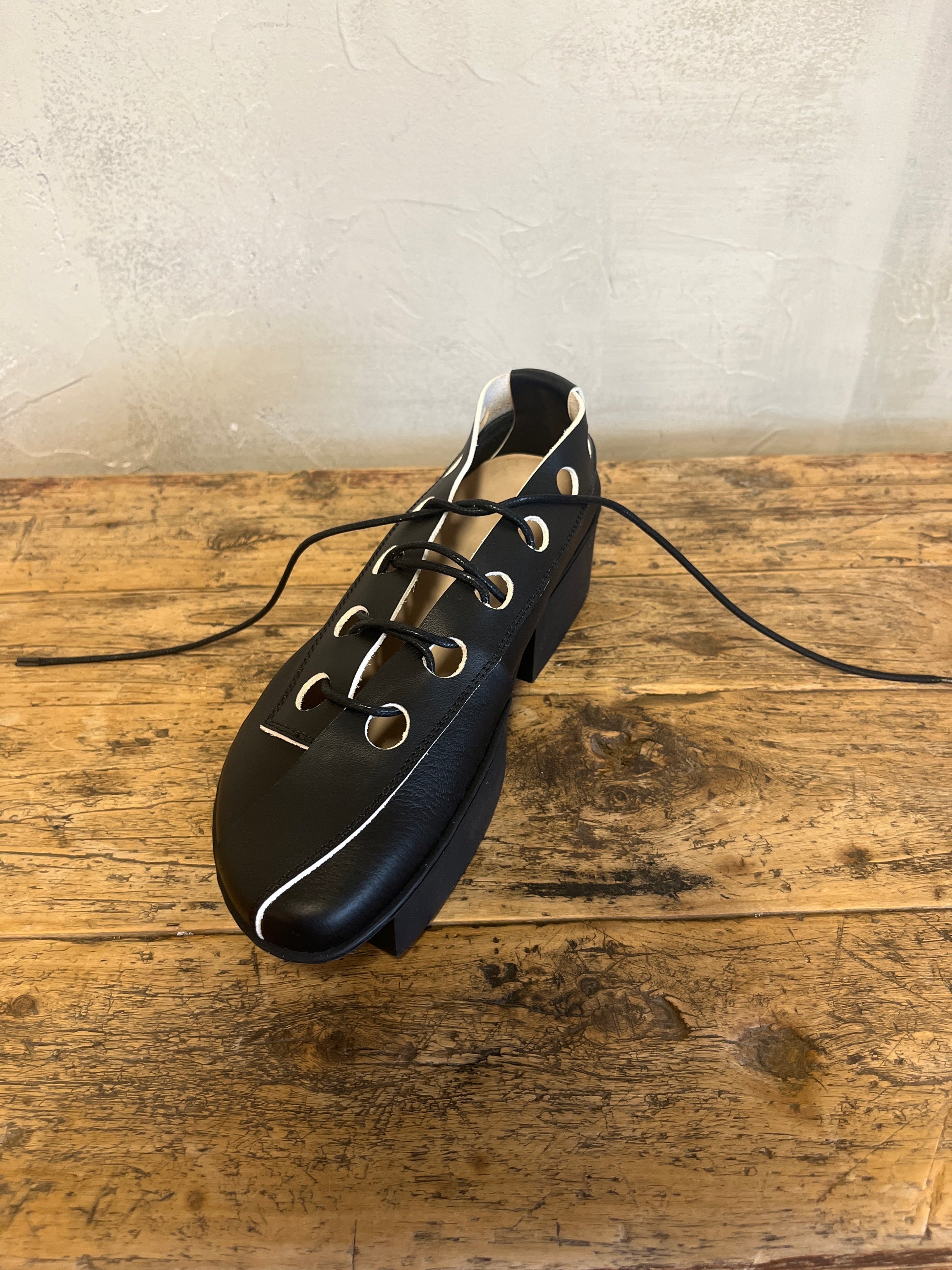 A perforated strip of sturdy leather encompasses the topline of this soft ballerina flat, serving also as holes for lacing.